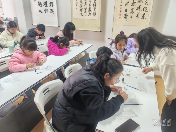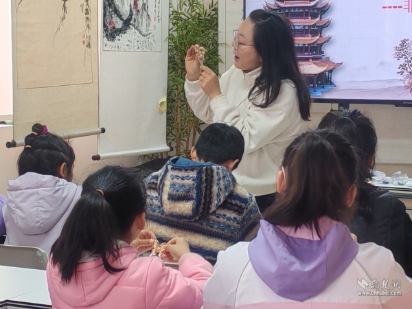 隨后,“閱讀媽媽”將話題自然引向非遺文化:“你們知道嗎?黃鶴樓不僅出現(xiàn)在詩詞里,還藏在楚繡的針腳中,藏在剪紙的紋樣里……”她通過展示精美的非遺作品,解讀楚繡中黃鶴紋樣的寓意,講述剪紙藝術(shù)如何再現(xiàn)黃鶴樓的雄姿。在她的娓娓道來中,黃鶴樓與荊楚非遺的淵源徐徐展開,孩子們聽得入神,眼中閃爍著好奇與向往。