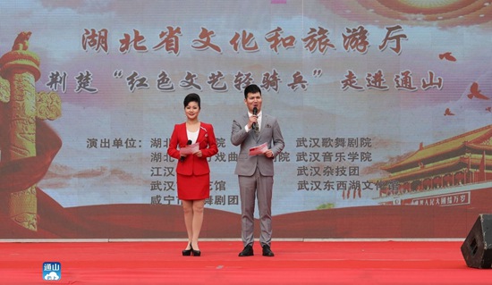 云上通山訊(通訊員 鄧文義 鄧娜)暖風和煦,遍地芬芳,最美人間四月天。4月11日,由省文化和旅游廳主辦,省文化活動策劃中心、咸寧市文化和旅游局共同承辦的“荊楚‘紅色文藝輕騎兵’文化扶貧”大型文藝演出走進板橋村,給村民奉上了一頓豐盛的文化大餐。省紀委派駐省文化和旅游廳紀檢監(jiān)察組組長、黨組成員陳鍇,市委副秘書長、省紀委駐通山工作隊隊長、副縣長胡長學,縣委常委、紀委書記、監(jiān)委主任劉海元,縣委常委、宣傳部長吳柏林觀看演出。