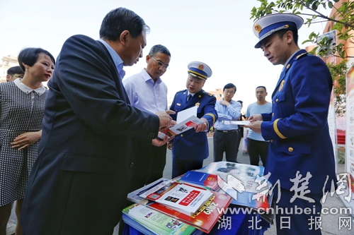 圖為發(fā)放消防宣傳資料現(xiàn)場。 官易洲攝