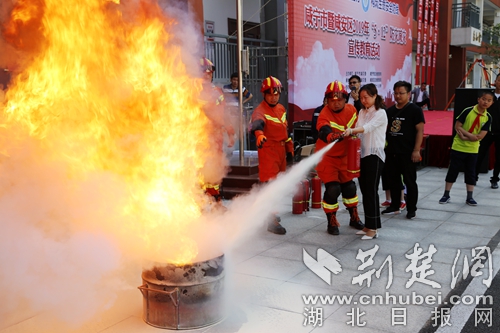 圖為宣傳員手把手傳授滅火器撲滅火災(zāi)現(xiàn)場。 官易洲攝