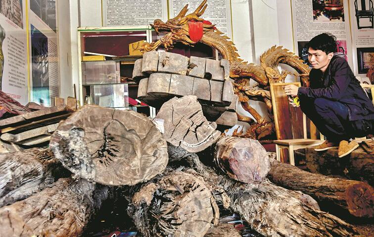 圖為:工作室內(nèi),堆滿了收集來的陰沉木