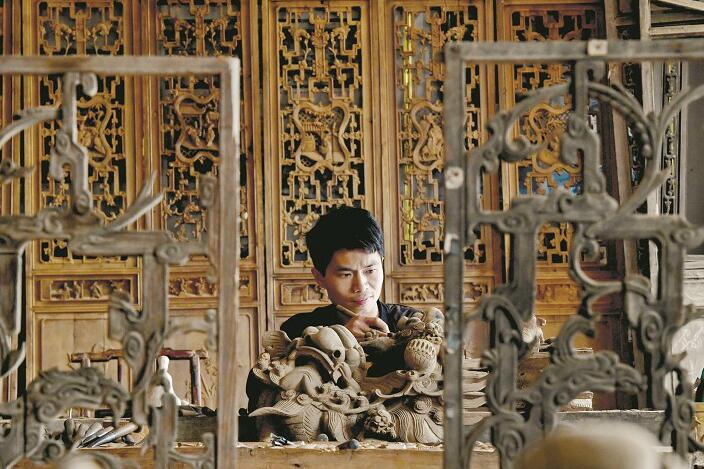 圖為:成希在雕刻房梁,一個個人物在他的刀下栩栩如生
