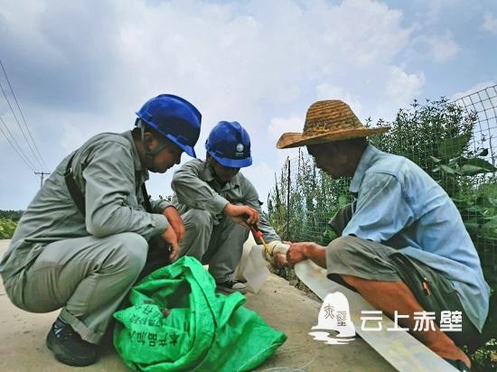 田紅云朋友圈中的這位微信好友是赤壁市供電公司的黨委書記余柒明。在得知斗門村農(nóng)田出現(xiàn)干旱的基本情況后,余柒明立即組織車埠供電所“星火”黨員志愿服務隊的志愿者們趕到現(xiàn)場勘查旱情,在向農(nóng)戶了解抽水灌溉的實際困難后,他們頂著高溫,將低壓線路引至遠處的水源地,裝設電能表、漏電保護器、連接抽水泵,經(jīng)過一個多小時的作業(yè),讓水嘩啦啦流入了農(nóng)戶干涸的農(nóng)田。