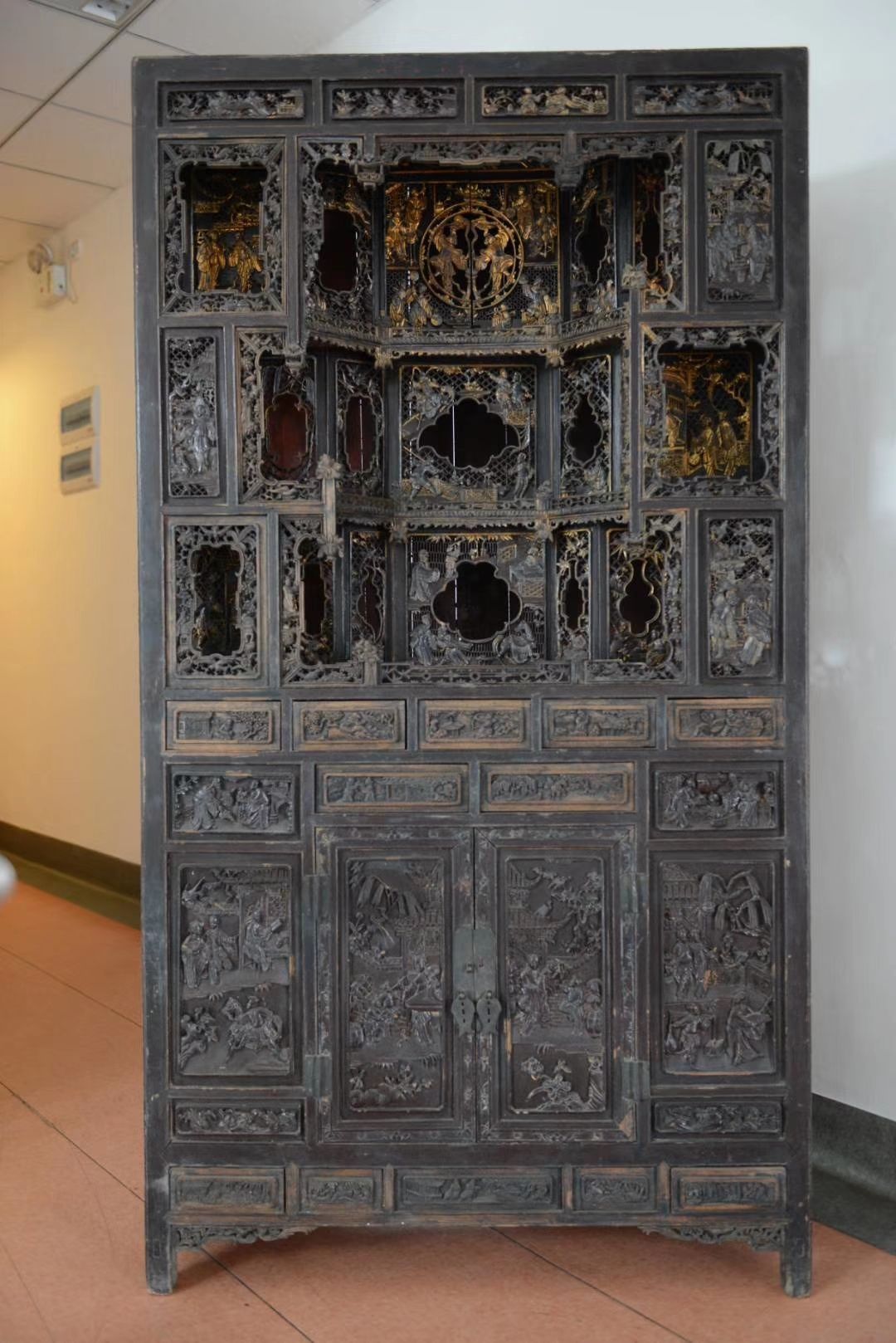 這種盛行于明末清初的“看櫥”,既有實用性又有裝飾性,之所以稱之為“看櫥”,是因為在高192 cm,寬104cm,深45.7cm的有限體積內,以不同的樓臺亭閣布局,雕飾86組神話人物、戲劇故事和花鳥圖案,做到繁而不亂,一目一景,景景相聯(lián),出神入化,讓人目不暇接,原件現(xiàn)存湖北省群眾藝術館?!翱礄弧蹦依送ㄉ侥镜竦乃械窨碳挤?,代表著通山木雕的最高水平。成希和謝志兵(通山縣非物質文化遺產保護中心主任)想復制它。