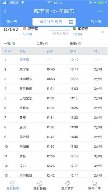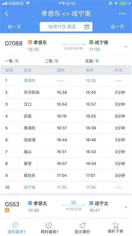 10時(shí)40分從咸寧南始發(fā),沿途??肯虒帠|、橫溝橋東、賀勝橋東、土地堂東、紙坊東、普安、廟山、湯遜湖、南湖東、武昌、漢口、天河機(jī)場等站,13時(shí)04分終到孝感東站;