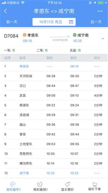 17時(shí)09分從咸寧南始發(fā),沿途??肯虒帠|、橫溝橋東、山坡東、紙坊東、廟山、湯遜湖、南湖東、武昌、漢口、天河機(jī)場等站,20時(shí)11分終到孝感東站。