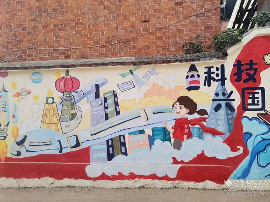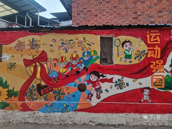 這面墻體上繪制了沐浴黨恩、運(yùn)動(dòng)強(qiáng)國、生態(tài)文明、科技興國、與黨同行、向黨向未來六大主題,其中既有充滿活力、朝氣和正能量的向日葵、麥穗、綠樹等植物,又有熊貓、猴子、兔子、獅子等可愛的動(dòng)物。