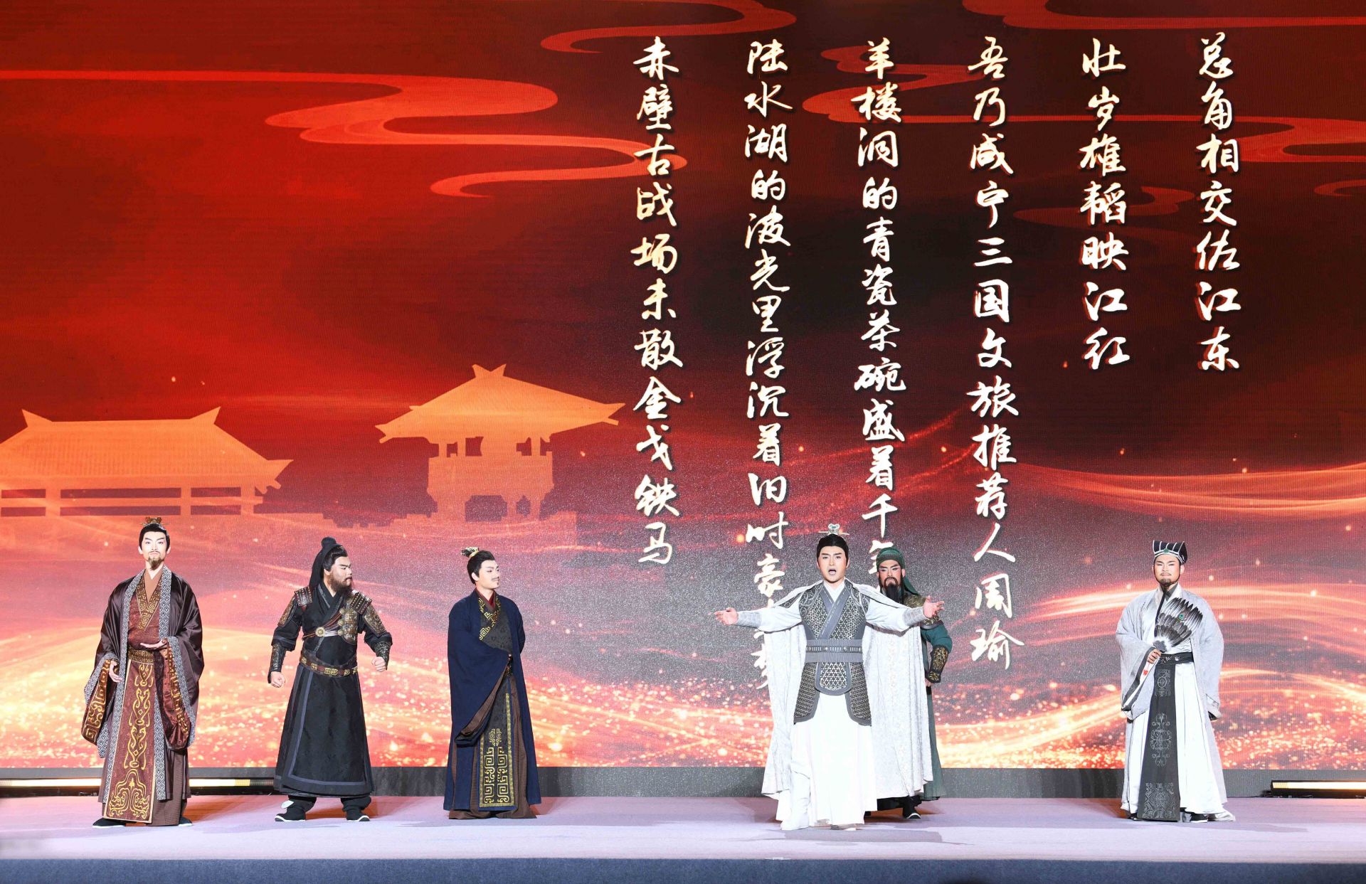 “三國(guó)六城,今日結(jié)盟!與君共同開(kāi)啟,荊楚三國(guó)文化之旅?!眴?dòng)式上,身著古裝的文旅推薦官,化身三國(guó)英雄劉備、關(guān)羽、張飛、諸葛亮、孫權(quán)、周瑜等,穿越歷史時(shí)空,分別代表武漢、荊州、宜昌、襄陽(yáng)、鄂州、咸寧對(duì)外推介各地三國(guó)旅游景點(diǎn)和線(xiàn)路。