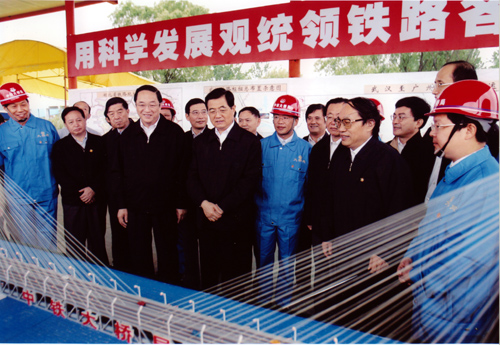 2005年8月22日上午,中共中央總書記、國家主席、中央軍委主席胡錦濤同隨行的中共中央政治局候補(bǔ)委員、中央書記處書記、中央辦公廳主任王剛,在中共中央政治局委員、湖北省委書記俞正聲,湖北省省長羅清泉等陪同下,考察了正在建設(shè)中的武漢天興洲公鐵兩用長江大橋工程,對鐵路建設(shè)作出重要指示。胡總書記指出,武廣鐵路客運(yùn)專線和武漢天興洲大橋是中國鐵路建設(shè)史上新的里程碑。這條鐵路線的建設(shè)標(biāo)志著中國鐵路客運(yùn)專線建設(shè)的開始,今后要建設(shè)更多的鐵路客運(yùn)專線。一定要把武廣客運(yùn)專線和天興洲大橋這個(gè)我國鐵路建設(shè)史上新的里程碑工程建設(shè)好。