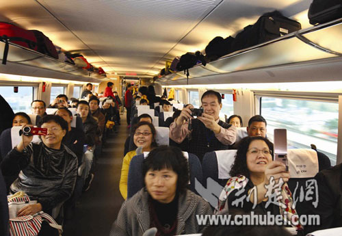 荊楚網(wǎng)消息 (楚天金報記者譚新杰 通訊員郭金富、劉強)12月26日上午9時,三列嶄新的時速350公里“和諧號”高速列車從武漢站、長沙站和廣州北站同時首發(fā),標志著目前世界上運營速度最快、一次性建成里程最長的高鐵新干線——武廣客專正式投入運營!瓣懙仫w行下廣州,千里南國一日還”的時代已經(jīng)到來。