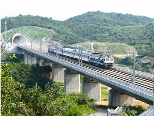大瑤山位于湘粵交界之處,素有“南嶺險關(guān)”之稱。上世紀80年代,修建衡陽到廣州復(fù)線,建設(shè)者用7年時間在這里修建隧道,全長14公里,是當(dāng)時國內(nèi)最長的雙線電氣化隧道。這次,武廣客專的方案是修建隧道群,由1號、2號、3號隧道組成,橋隧相連。3條隧道全長25公里,用了3年半全部竣工。