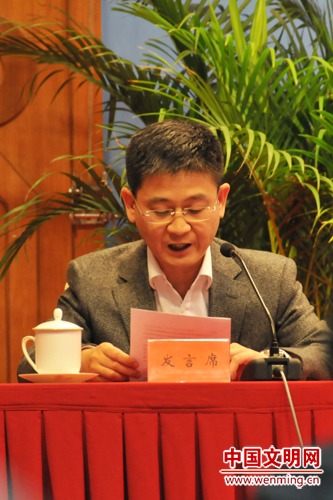 人民網(wǎng)總裁兼總編輯廖玒代表全國百家網(wǎng)站宣讀《爭創(chuàng)“文明網(wǎng)站”倡議書》。