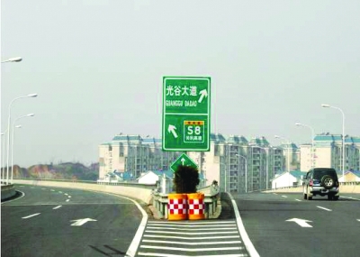 三環(huán)線由天興洲大橋往東新開發(fā)區(qū)光谷大道的一塊指路牌,左行指的是“關豹高速”,右行指的是“光谷大道”;但該路口左行是經(jīng)武黃高速去鄂州方向的,右行是經(jīng)三環(huán)線去白沙洲大橋方向的。路牌因信息不全、牌面又小,不少駕車人員到該路口時停車查看,不知行進方向。