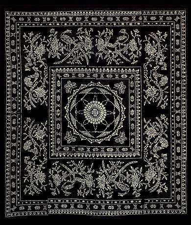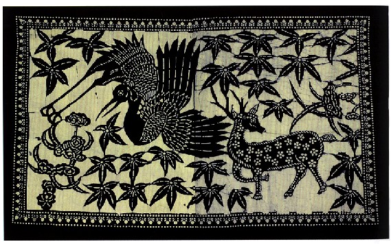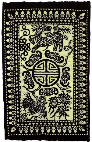藍(lán)印花布遍及湖北全省,尤以天門藍(lán)印花布最負(fù)盛名。其特點:1、藍(lán)與白的選擇,藍(lán)白兩色并非吉祥色,然而經(jīng)過藝人們的巧妙的藝術(shù)處理,使人感到清新明快;2、虛與實的結(jié)合:以點組成線,以線組成面,若合若離,似為一體,實又分離。